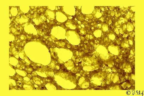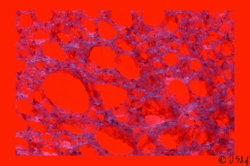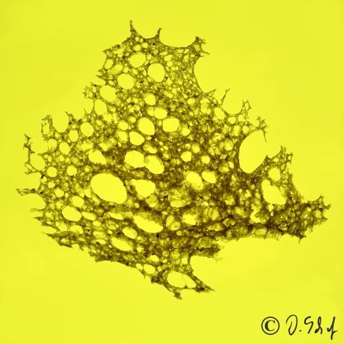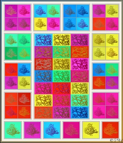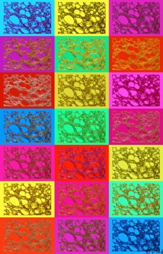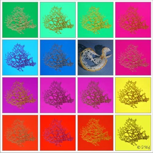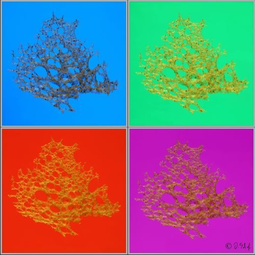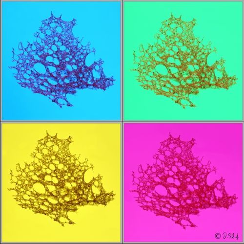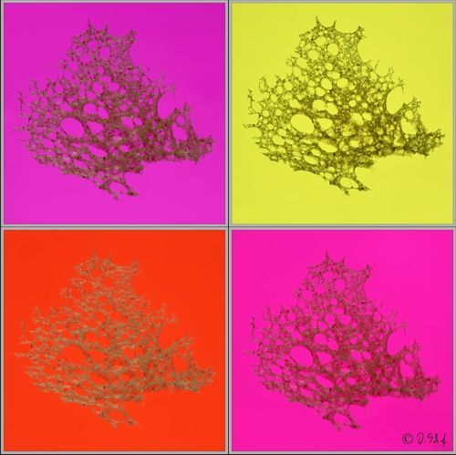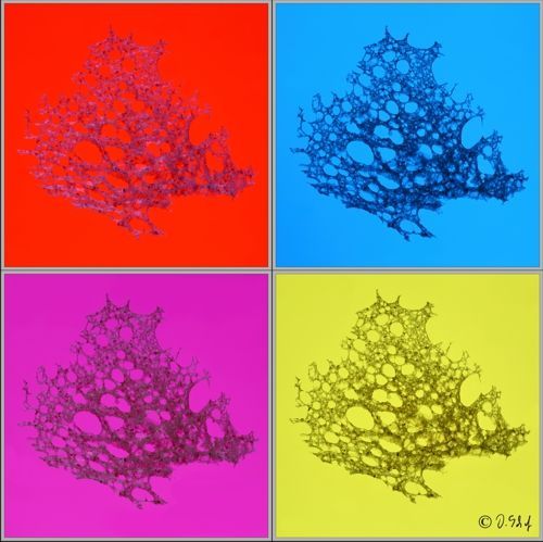 Die Farben der Bilder wurden mit unterschiedlichen Farbfolien auf dem Leuchtisch unter der sehr dünnen Brotscheibe sowie Beleuchtung mit verschiedenen Farben rein analog erzielt.